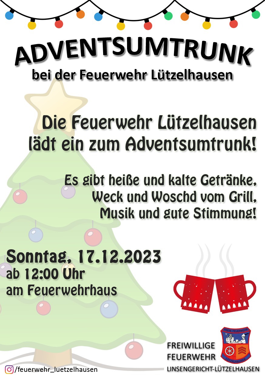 Am Sonntag den 17.12.2023 richtet die Feuerwehr Lützelhausen einem Adventsumtrunk aus. Angeboten werden warme und kalte Getränke sowie Bratwurst im Brötchen. Beginn ist ab 12 Uhr am Feuerwehrhaus. Wir freuen uns auf euren Besuch.