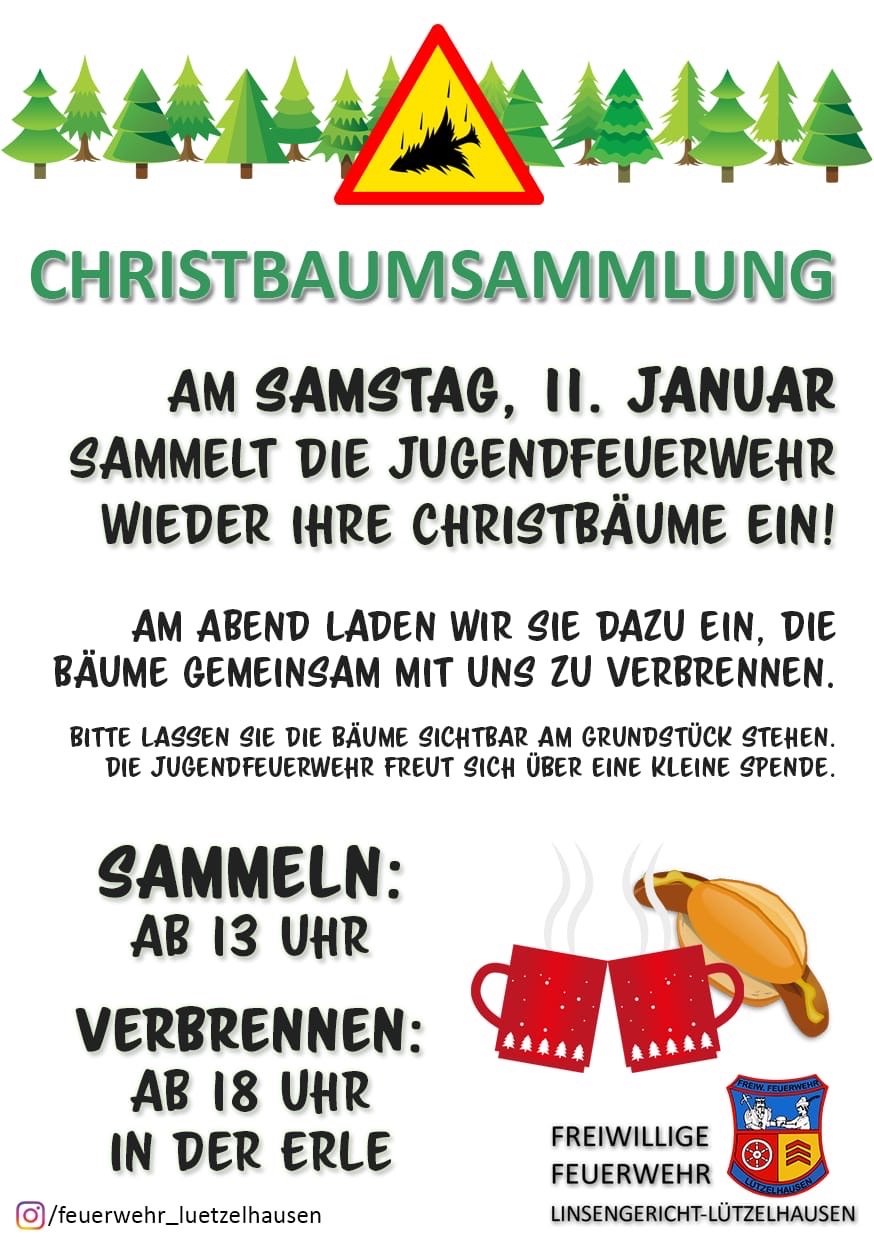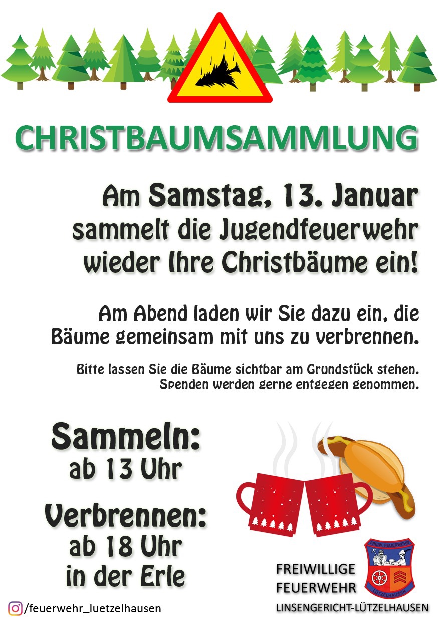 Am Samstag den 13.01.2024 werden ab 13 Uhr die Christbäume von der Jugendfeuerwehr eingesammelt. Die Bäume sollen sichtbar am Grundstück stehen. Über eine kleine Spende würden wir uns freuen. Am Abend möchten wir Sie dazu einladen, gemeinsam mit uns die Bäume zu verbrennen. Beginn ab 18 Uhr auf dem Festplatz in der Erle. Wir freuen„[Verein]“ weiterlesen