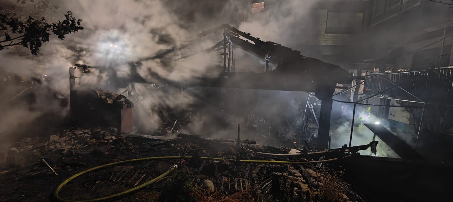 📟F2-Sonstige Feuer 📍Linsengericht Eidengesäß ⏰Donnerstag den 23.11.2023 Am Donnerstag den 23.11.2023 wurden wir gegen 04:50 Uhr zu einem Brand nach Eidengesäß alarmiert. Vorort brannte eine Garage mit anschließender Gartenhütte in voller Ausdehnung. Wir unterstützen die Löschmaßnahmen mit Atemschutzgeräteträgern.